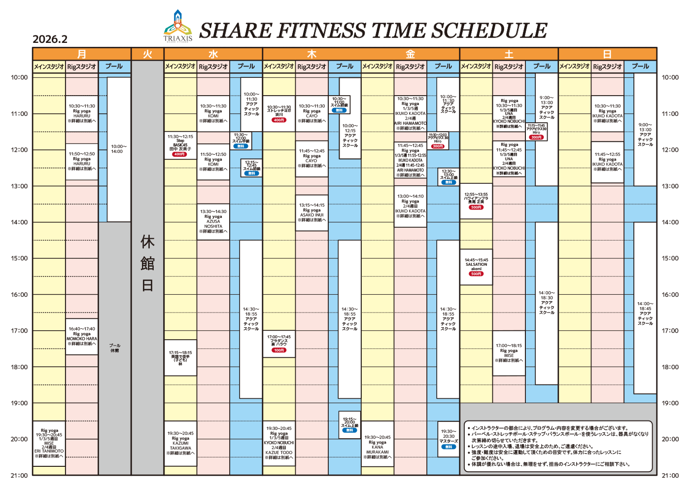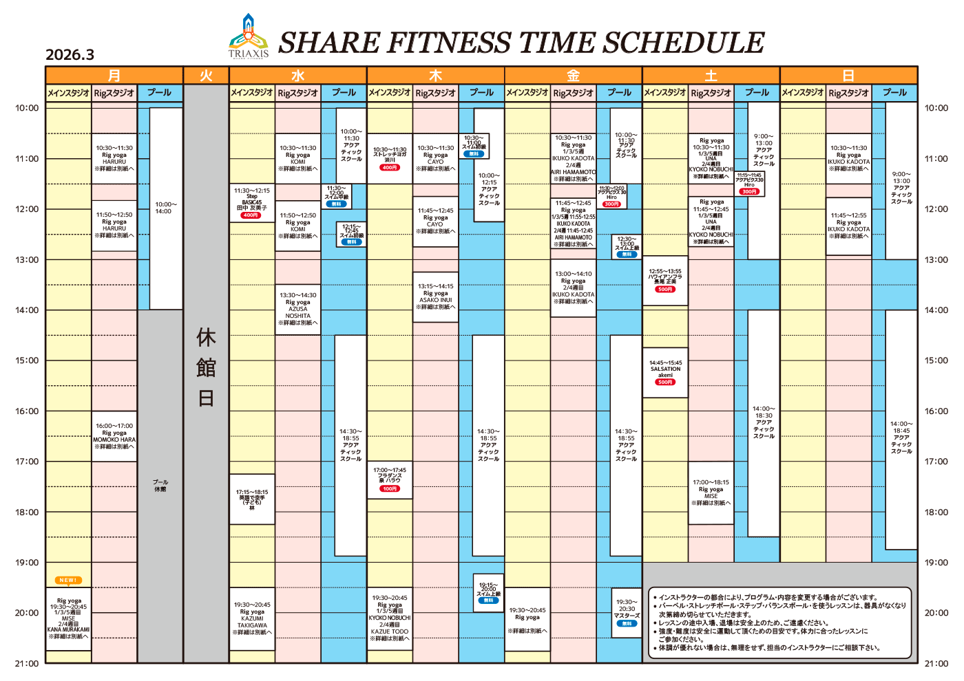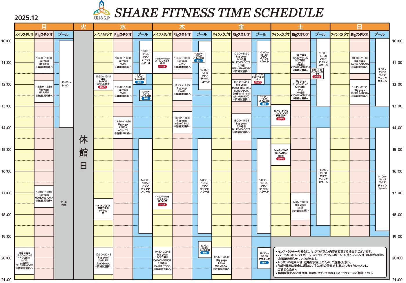 是非、多彩なプログラムにご参加いただき、素晴らしいインストラクターと素敵な時間をお過ごしください。ここTRIAXISが、元気になれる心地良い場所でいつまでもありつづけますように、会員様もインストラクターも施設運営スタッフも皆でシェアして、ウェルネスな(輝くような生き生きとした)環境を一緒に作り上げてゆきましょう。