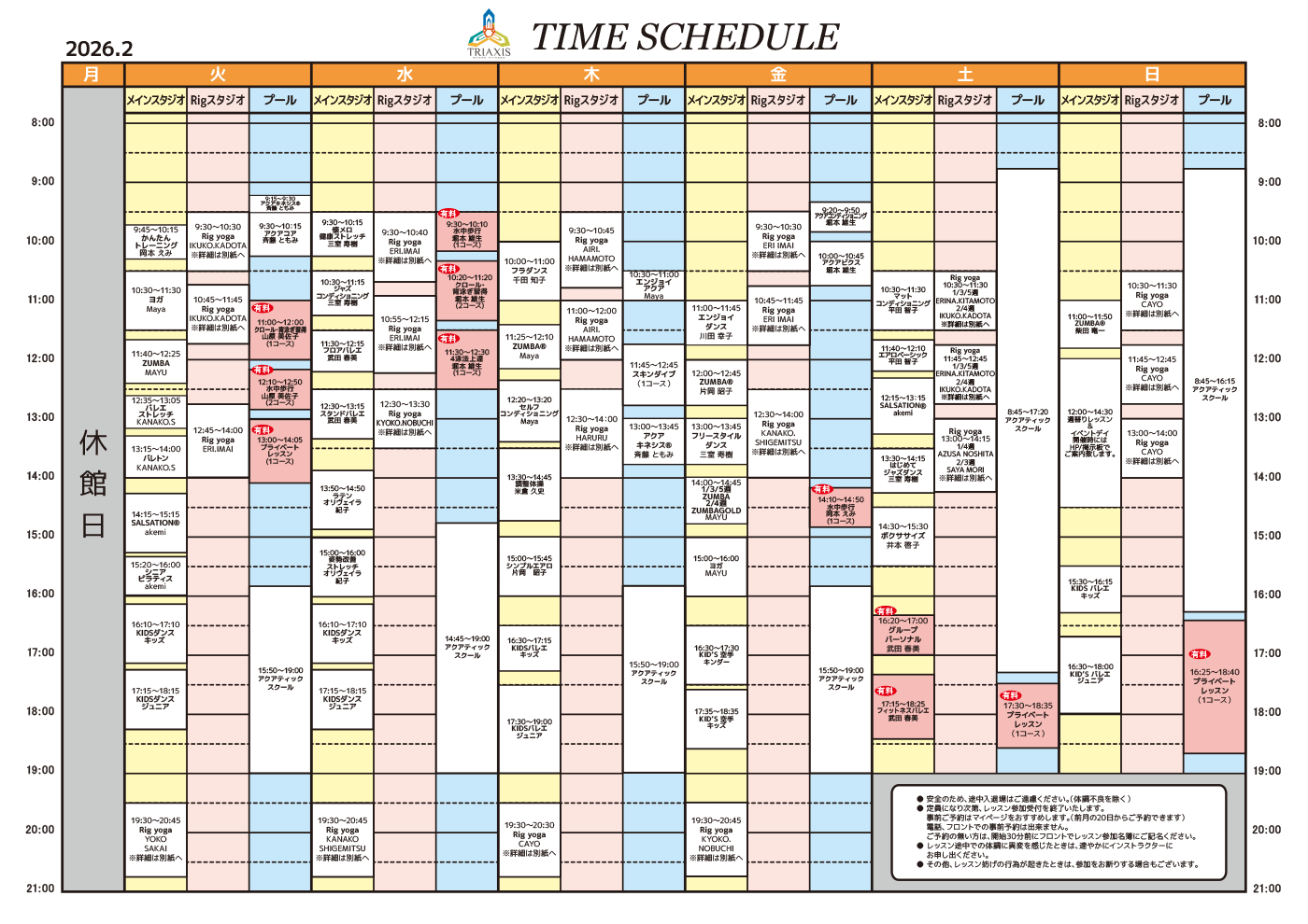 ※ レッスンの途中入場、退場は安全上のため、ご遠慮ください。