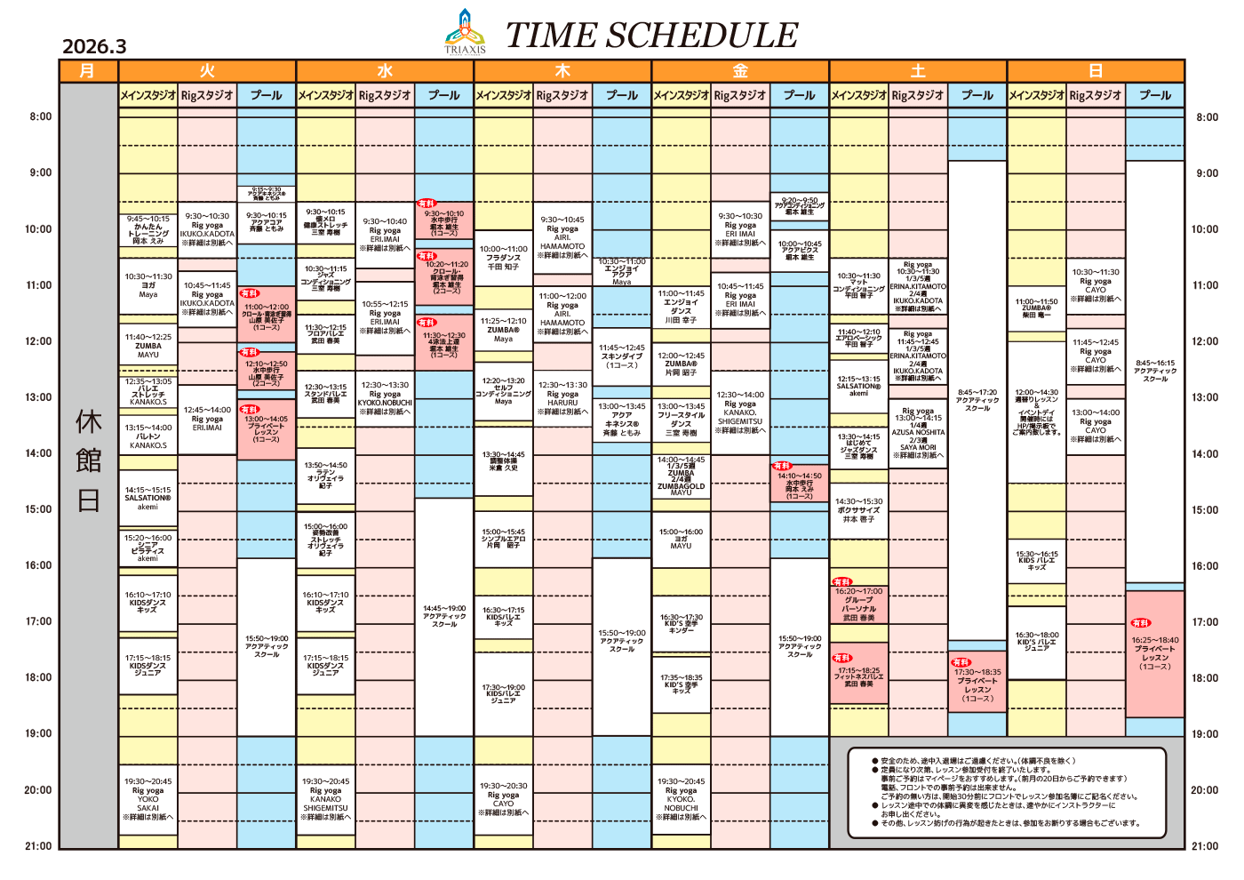 ※ 体調が優れない場合は、無理をせず、担当のインストラクターにご相談ください。